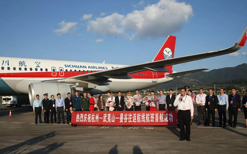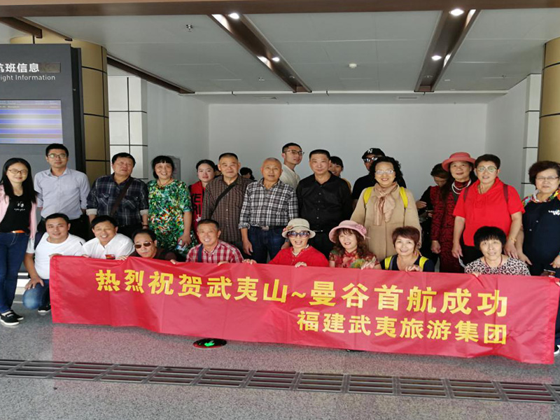 闽北首条国际航线(武夷山 ⇌泰国曼谷)2018年11月6日起首航11月6日,福建武夷山机场正式开通杭州—武夷山—曼谷航线,武夷山机场举行了首航仪式,南平市委常委、市政府常务副市长伍斌宣布通航。成功首航标志着武夷山机场首条国际航线正式开通,为福建武夷山和泰国曼谷搭起了空中桥梁。该航线是闽北首条国际航线。此航线航班的首年《往返航班联营合作协议》由南平武夷旅行社有限公司签得。
